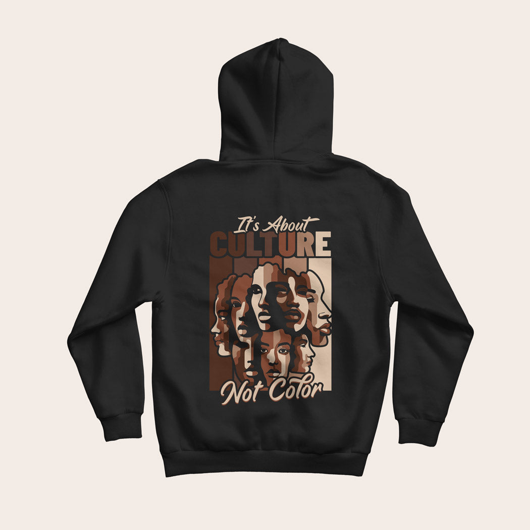 "It's About Culture, Not Color" hoodie is a reminder that every culture has light- and dark-skinned people. We need to look past the exterior and focus on love, respect, acceptance, and embracing one another regardless of skin tone.